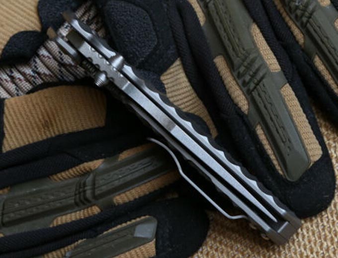 背夹:1.0mm TC4钛合金 手柄双面3D立体CNC精细加工, 刀刃手工精细打磨 陶瓷定位珠 刀柄喷砂处理 刀刃石洗,