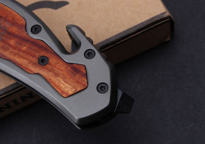 类型: 快开折刀刃材:440硬度: 57HRC全长:20.5CM刃长:8.8CM刃厚: 0.3CM刃宽:2.5CM (最宽处)柄长: 11.5CM表面:镀钛柄材: 钢+木酸枝重量:207克锁定:侧锁配 :彩盒