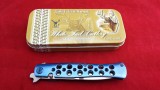 COLD STEEL(冷钢) TI-LIFE折刀,镜面款!规格 CM全长: 22刃长:10刀柄 :123刀厚:0.3重量: 150克刃材料 AUS-8硬度 57刀锁:衬锁表面 巴黎蓝 冷钢26S新款,英俊的梭子型刀身!,细长穿刺型刀刃,拥有强大的穿刺和切削能力,鲨鱼背鳍式的突起及刀刃上的拨钮结构,可以单手快速的开关刀。刀刃衔铁上设有护手的赌徒刀设计,内衬卡锁,向所有人提供了易于操作的优良性能