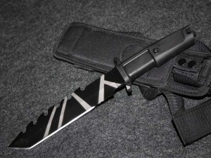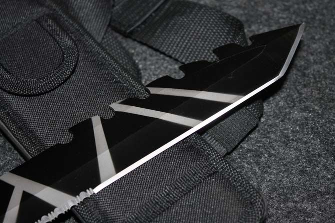 该刀按原品100%进行仿制,无论是刀套或是刀体的制作工艺都要求相当高。刀身精细铣齿,水磨精细开刃,刀身经灰钛处理,不起划痕。刀身纹理和标识采用激光一次打标而成,激光纹理精细度极高、纹理清析并不易刮花。刀柄和采用优质复合橡胶制用。刀套采用和原品一样的高档尼龙材料按原品复制,精细高,经久而耐用。
