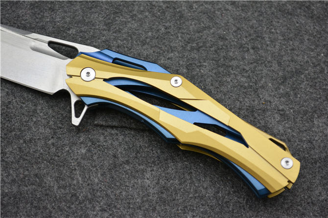 品牌:变型金刚 全长:228mm 刃长:96mm 柄长:130mm 刃宽:30mm 刃厚:3.9mm 刃材:D2(深冷处理) 重量:310g(含包装物) 硬度:58-61HRC 表面:拉丝+石洗 柄材:手柄全TC4钛合金手柄电脑椤缕空、底骨TC4钛合金蓝色阳极电镀处理。 刀夹:TC4钛合金 锁型:分体插入锁杆式线锁。 螺丝:所有螺丝420不锈钢、硬度HRC45、全CNC精雕加工。 结构:分体插入锁杆式线锁结构、锁刀接触镶嵌合金粒、陶瓷定位珠、内置平面滚针轴承垫片。 其他:礼品盒和仿皮套.