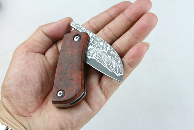 本大马士革无锁折刀刀柄采用稀缺天然红影木,底骨人工雕花,搭配合适,非常漂亮,加上做工难度高,木材稀少,刀匠只产了少量,卖完不再生产,欲购从速。
