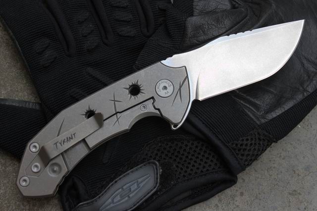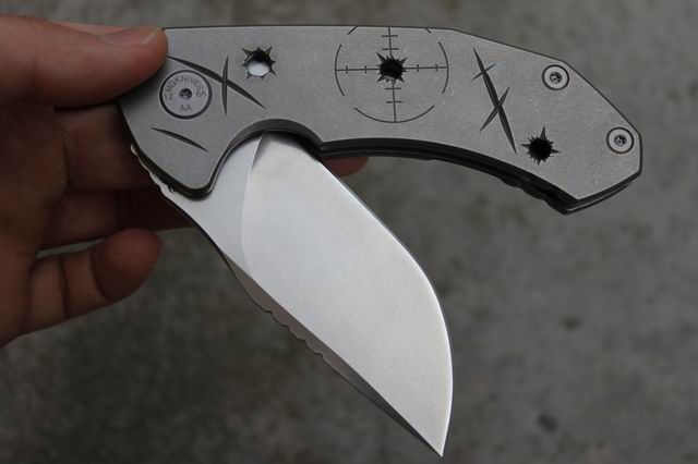 手柄处理:轻度石洗; 表面的子弹坑都是纯手工精磨的(每一把都不一样),正面子弹射入,反面穿出,所以后面的孔比正面的大,其中一颗没有射穿,所以形成了一个凹坑,这样的细节设计,是不是很用心。配合刀痕的设计,有没有“暴君”味实足~~~