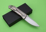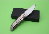 处理材料:钛硬度:58-60HRC表 面 ﹔石洗系统:球轴承系统(陶瓷球轴承)最新的拔手钉快开方式,开合更加顺畅,全钛刀柄,时尚烧钛花纹;刀片采用9Cr18Mo材料,全手工打磨,线条流畅;最高要求的精准的外六角止位钉,更显工艺高超;内嵚式合金锁位片,使刀柄表面光滑,给人最美观感!这就是全新的