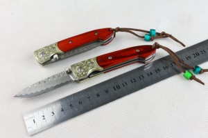 全 长:163mm 刃 长:67mm 柄 长:96mm 刃 宽:22mm 刃 厚:2.3mm 刃 材:大马士革钢 重 量:200g (含包装) 硬 度:57-60HRC 表 面:原有大马士革纹 柄 材:雕花纯铜+天然科檀手柄,木纹纹路清楚. 锁 型:线锁。 其 它;礼品盒+皮套包装.科檀木和钢片之间不会有空隙,是刀匠做好刀的可见之处
