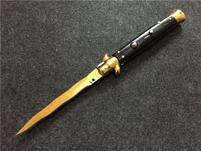 11寸“意大利AKC古典跳刀-(黑牛角木镀金水波刃)
