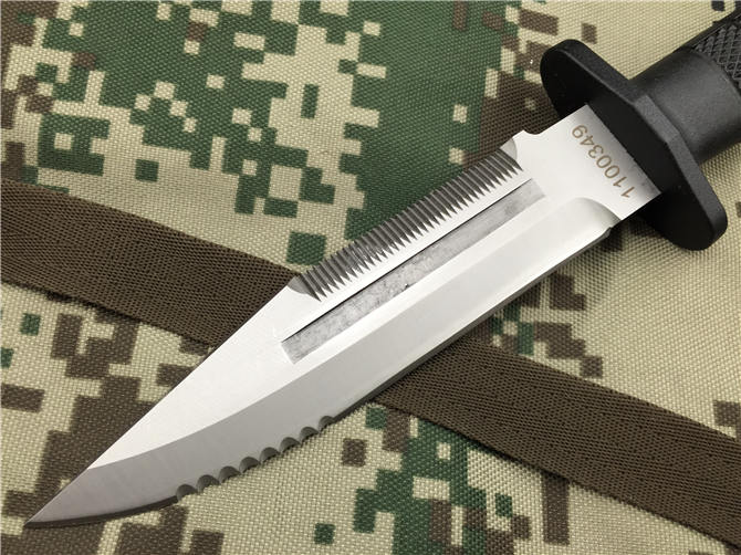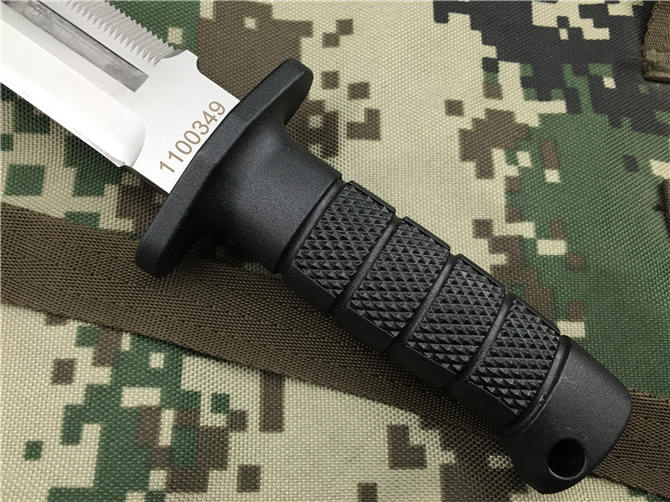 刀体为锋利的单面刃口,能快速割断降落伞伞绳和其它绳索。刀背有一段坚利锯齿,能锯断f飞机铝壳体和电缆。刀体刻有血槽,刺入敌人身体后,能顺利拔出,同时使刀体重量降低至220克,并增强了刀体的刚度,提高抗弯抗扭能力。刀体材料为5Cr15Mov ,为防止刀体反光,提高隐蔽性,表面经喷砂处理使之呈暗灰色。