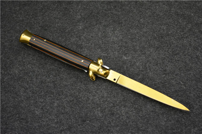 意大利黑手党使用的经典刀具-赌徒跳刀,在电影"教父"里出尽了风头!11英寸(28CM)天然黑牛角柄的黑手党侧跳,出刀迅速,锁定稳固,具有超强的穿刺力!带有保险装置,刀护手处暗藏闭合开关,,AKC公司出口产品,功能性完工度不错,满足把玩和收藏的需要