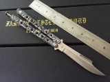 The One BM异形款之插槽刃,由The one (唯一)精工打造,是现成BM系列变异款式,刃型奇特,水滴形刃附加插槽副刃,非常凶悍!整刀用铆钉铆合,省去螺丝难维护的特点,一体柄型更坚固和耐摔,骷髅迷彩, 转动灵活,由THE ONE 出品,不可多得的精品甩刀!规格全长 23.8CM刃长 9.5CM刃厚 0.3CM刃材料 440C刃硬度 58柄材料 不锈钢压铸柄硬度 40重量 180克刀鞘 刺绣高级尼龙套,可横竖挂皮带