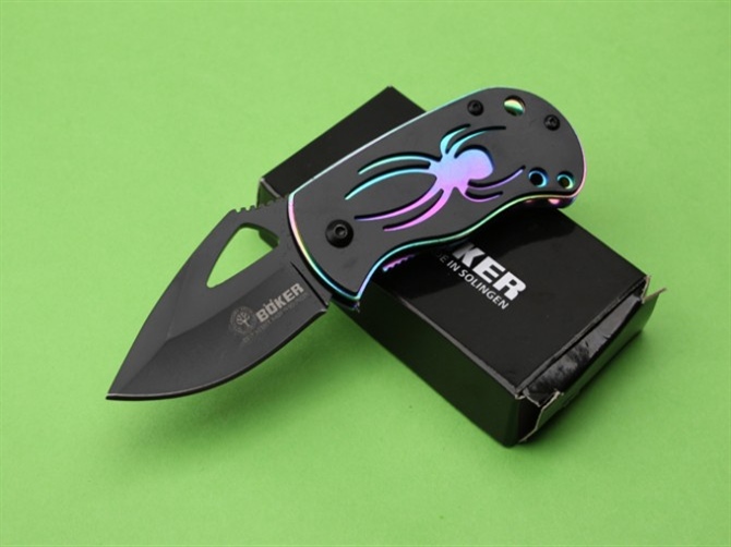 类 型: 折刀品 牌:BOKER(博克,仿品)型 号: 076全 长: 13.6cm 刃 长: 5.5cm 刃 宽: 3.6cm(最宽处)闭 合: 8cm(柄长)表 面: 发黑刃 厚: 0.28cm柄 材: 全钢+铝片,底层钢垫表面钛金幻彩,表层铝片镂空蜘蛛图案,组合成非常美妙的手柄设计锁 闭: 坚固侧锁。重 量:100克其 他:带坚固背夹,原装纸盒包装品 质: 高品质