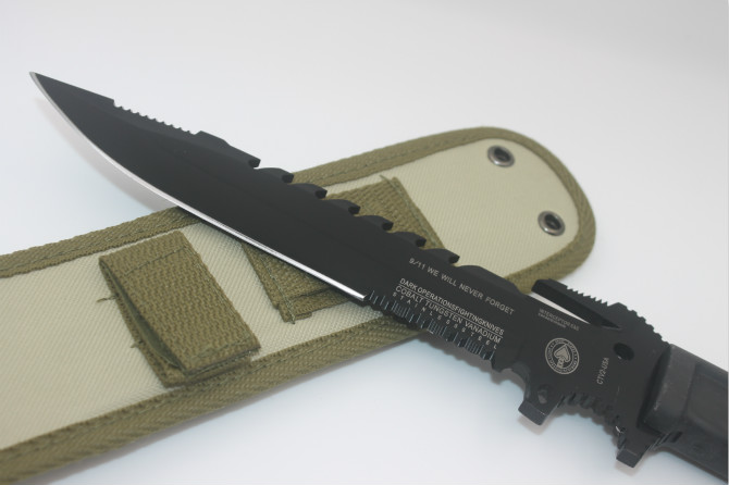 911不仅是为紧急呼叫,它还时刻提醒我们.在我们面对战争之前,我们是为英雄们而战斗! 以9/11致敬限量版命名它的名称,经常的有提醒美国人怀念失去的英勇努们,那些采用武器捍卫自由的人们 设计者为他们提供了组合良好,战斗最佳的武器. ctv2 钢的刃材,刀身长度超过8英寸,锯齿刀头,背齿刀身,使911成为令人难以置信的战斗有效工具. 911的锯齿,背齿,有进一步增强实时逃生和杀伤力.手柄后尖头更适合用于贯穿玻璃,窗户., 护手既是一种开瓶器和又是一个锋利的割绳器,紧急情况将得心应手!带齿的刀刃适合任何场合.大的背齿会使敌人的伤口经久不会愈合. 象所夜魔的刀刃一样,ctv2 钢将持续数十年性能不变. 100%,美国黑鹰出品! 黑色碳氮化钛(三种)真空图层,更有效的防锈,防止各种有腐蚀性物质对刀身的侵蚀. 类 型: 中型直刀 品 牌: 夜魔 全 长: 36cm 刃 长: 22.3cm 刃 厚: 6mm 刃 材: 7CR13 硬 度: 58HRC 表 面: 黑钛 柄 材: 橡塑 刀 鞘: 尼龙 其 它: 锋利