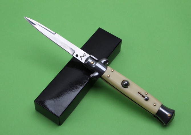 新款9寸AKC意大利黑手党-赌徒跳刀,在电影"教父"里出尽了风头!水波浪刃的黑手党侧跳,仿牛角亚力克柄,弹力超强,锁定到位,440枪刺刀刃镜面,带有保险装置,刀护手处暗藏闭合开关,出口产品,质量保证!满足把玩和收藏需要
