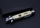 新款9寸AKC意大利黑手党-赌徒跳刀,在电影"教父"里出尽了风头!水波浪刃的黑手党侧跳,仿牛角亚力克柄,弹力超强,锁定到位,440枪刺刀刃镜面,带有保险装置,刀护手处暗藏闭合开关,出口产品,质量保证!满足把玩和收藏需要规格全长:22.9CM刃 长:10.2CM柄 长:325MM刃 厚:3.0mm刃 材:440刀 柄:象牙白纤维柄开刀方式:弹簧重 量:150克