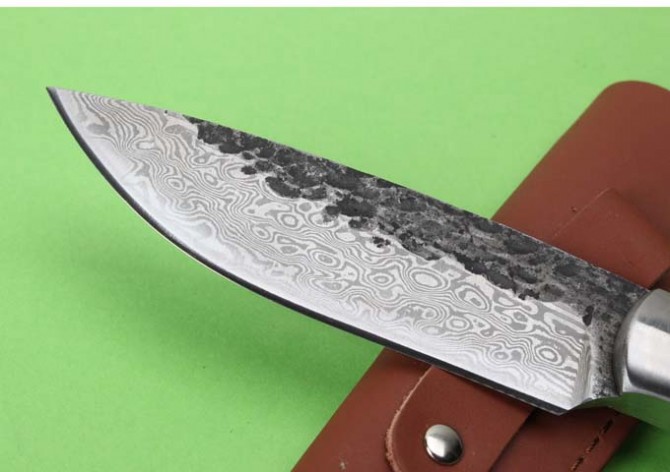 手工锻打、水磨开刃,整刀经反复淬火处理,硬度高,韧性好,切削性能极佳,可轻易把普通报纸切成丝条,可刮汗毛。刀柄采用名贵黑檀木,色泽和光滑度好,并护有钢头,坚固而用。 刀套为头层牛皮制作,整刀配上刀套,携带非常方便。该刀大小适用,无论是砍、削、切都能很好的胜任。是一款值得收藏和户外活动必不可少的好刀。 类 型: 手工直刀 全 长: 21.5cm 刃 长: 11.5 刃 宽: 3.4cm(最宽处) 柄 长: 9.7cm 刃 厚: 0.48cm 刃 材: 锻打花纹钢硬 度: 58RHC 表 面: 锻打花纹工 艺:手工锻造 柄 材: 钢头+名贵贝壳重 量: 300克(含套)其 他:手工水磨,刃口锋利,可刮汗毛。一体龙骨结构,配优质牛皮刀套。