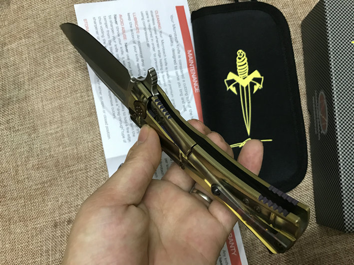 微技术竹节刀经名刀匠精选上好的钛合金版,后经度精度的CNC电脑椤成手柄竹节纹路,再经阳极处理成幻彩颜色手柄.手柄经人体力学设计而成,舒适自如,防滑等功能.刀的开合轴承是采用进口轴承,开合柔顺,不易磨损,更不会摇头.刀匠选刃材也大方,使用进口钢,沙光精细,再经真空热外理,硬度达58度以上,更加锋利耐用,刃性更好.包装是原厂彩合包装,使用上好高品质尼龙袋.这款刀做工难度高,日产量不多,只生产少量,欲购从速,的的确确是一款式高品质收藏刀,机会只有一次.
