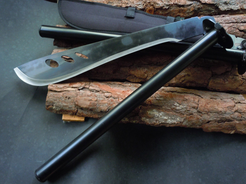 折叠三眼狼大刀,类似古时朴刀款式 ,折叠款式,携带方便,隐秘性强,按下手柄顶端的弹簧开关,即可将刀身折叠起来。直接拔开刀身就可打开,非常方便。