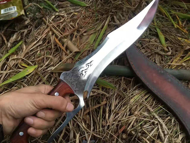全 长:38CM 刃 长:26CM 柄 长:约12CM 刀 厚:0.5CM 刃 面:超镜光 毛 重 :约600克(含刀鞘) 钢 材: 9cr18mov钢 硬 度:59HRC(真空油冷热处理) 柄 材: 红酸枝木 刀鞘:纯手工雕花皮鞘(采用可手工进口高档皮料)