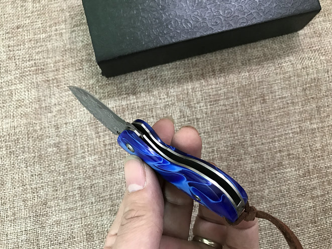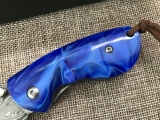 小折系列~蓝鱼鹰类 型: 大马士革肥彩贝鱼鹰收藏刀全 长: 12.0cm刃 长: 5.0cm刃 宽: 2.5cm(最宽处)柄 长: 7.0cm 硬 度: 58-60HRC刃 厚: 0.25cm 重 量: 约85g表 面: 纯手工制造原有花纹颜色刃 材: 正品进口Vg10大马士革钢