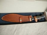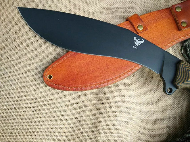 (BULL )公牛 出品人:华匠坊(原创) 材料:DC53 总长度:383MM 厚度: 7MM 刃长:240MM 柄长:143MM 刃最宽处:53MM 硬度:60+(真空热处理)真空处理韧性非常好 净重:0.685 kg 毛重:0.99 kg(包括刀和鞘,包装合) 12.9级战术锣丝 刀套:进口植糅革(手工做色,存在色差) 高级精装包装合 刀条采用手工精细砂光和镀钛黑 柄材:G10