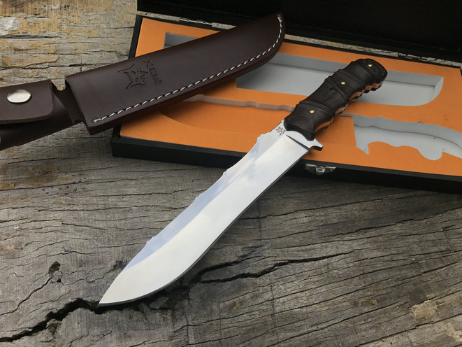 全长:30CM刃长:18.5CM柄长: 11.5CM刃材:7Cr17硬度: 58HRC刃厚: 0.59CM刃宽:3.3CM (最宽处)涂层:镜光柄材: 黑檀木(手工雕刻)刀鞘:皮套(配木盒)重量:900g(含包装)其他:非一般的手工!