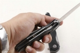 刃 长;9.0cm柄 长:12.0cm刃 宽:2.3cm刃 厚:3.0mm刃 材:9CR18mov重 量:146g(含包装物)硬 度:59HRC表 面:精细沙光柄 材:钢片+G10手柄精镶碳纤.内置轴承。锁 型:线锁其 他:配黑盒,配刀背夹