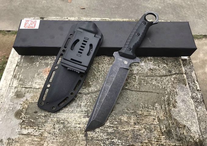总长:29cm,开刃地方:14cm,刃厚:6MM,刃宽:3.5cm,钢材:D2钢,硬度:59-60HRC,柄材:黑色G10,刀鞘:战术K鞘,配夹子