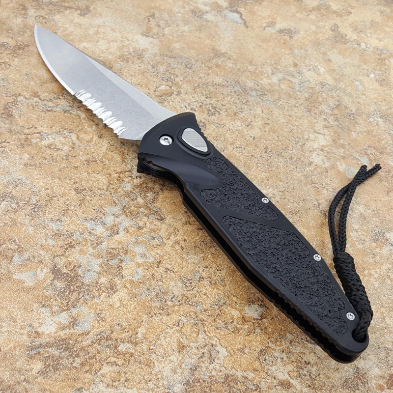 socom elite 是微技术为海豹特战队设计的半自动战术折刀,2005开始装备, 镂空的铝柄,防滑3M沙粒贴片,手柄右上角部署了快递打开按钮,倒锥型战术刀刃,锁定坚固耐用!经典的战术折刀