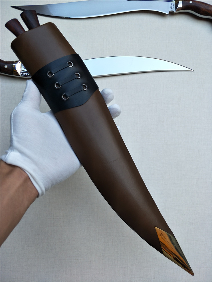 廓尔喀弯刀,原产尼泊尔,是尼泊尔的国刀,状如狗腿的刀身赋予其超凡的劈砍能力,在刀身底部会有小小的V形凹痕,可以将拔出后的鲜血导引,以免玷污刀柄.该刀除用于近身格斗外,还是优秀的野外求生刀具,适合修理装置、挖洞、磨利帐篷支柱、切肉、开罐头、解剖猎物等.而且刀套背面有两把小刀,开口的是用来削东西去皮的,未开口的是用来磨刀的.让此刀声名远扬的是其最早使用者(目前该刀在各国特种部队中颇为流行)--隶属英军的尼泊尔廓尔喀步兵团,廓尔喀士兵勇猛彪悍,在两次世界大战中让其对手(如纳粹德军、小日本鬼子)吃尽苦头,在二战后的英国参加的数次战争也发挥了重要作用(如1982年英阿马岛战役),此外,廓尔喀兵团还是英国在各殖民地的重要武装力量(在香港回归前驻港英军也有廓尔喀兵团), 由于其重要性.英军至今仍保留这一建制.