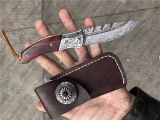 新款上架【猎影】刀刃选用VG10刃钢大马士革锻打祥云纹(有黑白与抛光可选)刀柄精挑科檀木镶嵌石刻火焰纹刀隔,几经手工精心制作而成。随刀赠送头层牛皮手工缝制皮套,精美包装。【猎影】全长18.2cm,刃长8.2cm,刃厚3.6mm,硬度60HRC。首批数量有限。