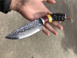 钢材层采用VG10钢纯手工锻造经典实用型猎刀总长:约24充cm,刃长:11cm,刃厚:4MM,刃宽:4cm,钢材;日本夹层VG10大马士革钢,73层,热处理:真空深冷油淬,硬度:58-60HRC,柄材:天然野生黑羊角+野生牛骨,+钢片,皮套:意大利进口植鞣皮,纯手工缝线雕刻,镶嵌天然野生蟒蛇皮!每一把都是独一无二,收藏者独特效果!喜欢朋友尽快下手