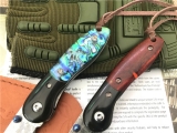 刃 长:6.1cm柄 长:8.5cm刃 宽:1.8cm刃 厚:2.5mm刃 材:VG10大马士革钢硬 度:60HRC表 面:大马士革原纹。柄 材:花酸枝木或贝壳+黑檀木.锁 型:侧锁其 他:加厚黑盒+真皮套。