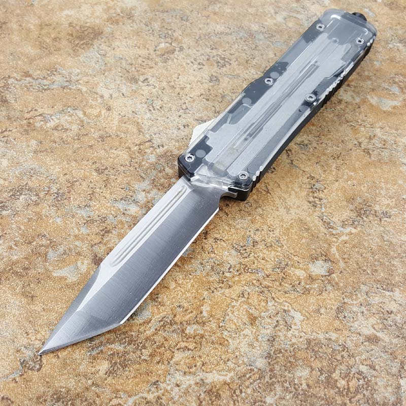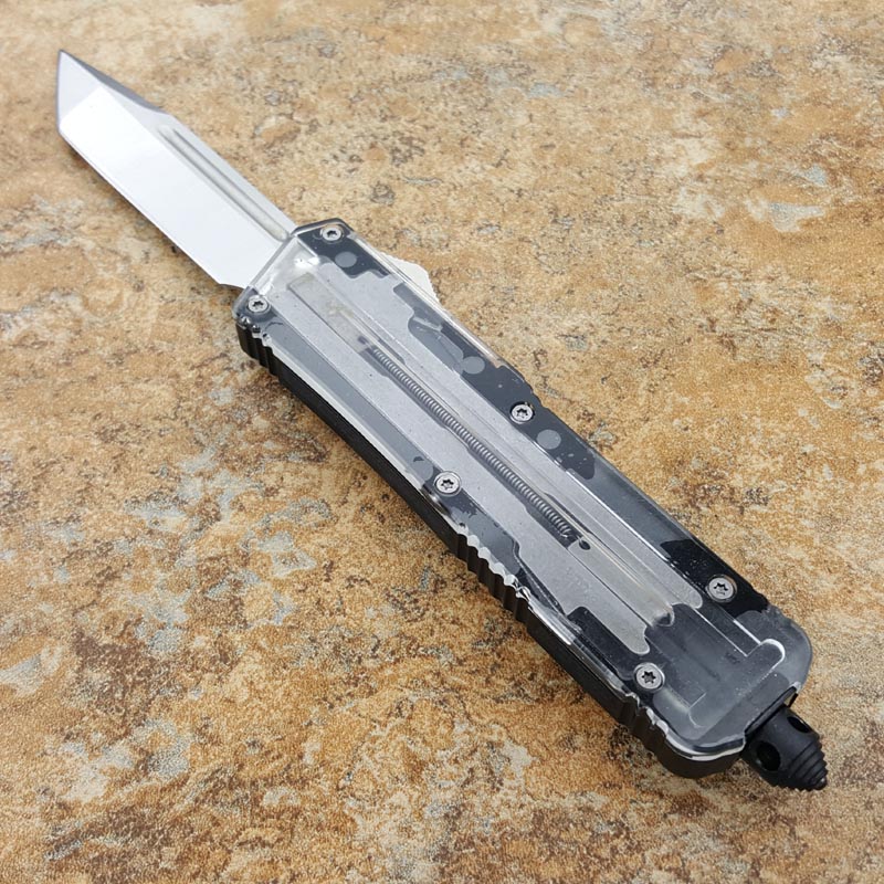 Theone 圣甲虫直跳刀透视款, 数控刃,Tanto武士和double edge双锋刃,盖子用透明树脂纤维雕刻而成,里面的弹锁机构一目了然! 非常个性