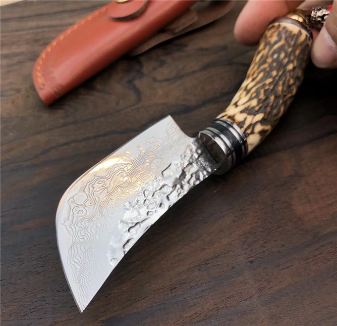 全长尺寸:15cm、刃长:7cm、手柄长:8cm、厚度:3mm、硬度:59HRC、【钢材】大马士革钢VG10、、、、手柄用料:白钢头+牛角隔片+天然精选鹿角柄、尾部可穿各种吊坠[色]、、、配套包装/高端