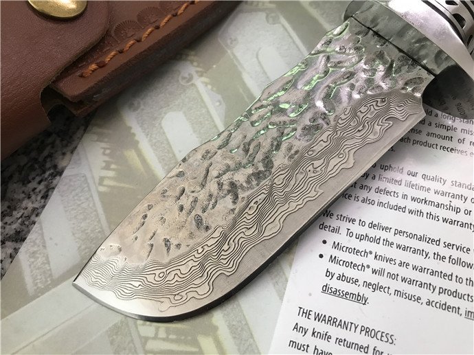 重磅推出雪花纹大马士革黄羊角猎刀,一把不可错过的收藏级猎刀,用料更是毫不吝啬,真材实料!此款刀刃是用4.2mm的雪花纹大马士革手工打造完工刃厚4.0+mm!刀刃首次镶黄铜手工雕刻火星坑,凸显尊贵不凡!柄材选用的是世上稀有的蒙古野生羊角!、手感极佳是收藏、把玩、馈赠亲友的佳品,数量不多,喜欢此刀的朋友马上下手吧!!