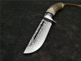 【圣刃】采用高硬度高档刀具钢,67层VG10芯层锻打大马士革钢刀刃,表面保留原始深层锻打的花纹靓丽大气,刀身圣刃更加霸气,不锈钢护手户外活动中更安全顺手,手工缝线植鞣牛皮刀鞘更加大气非凡!精选天然鹿角打磨精细舒适,牢固更显品牌价值!配意大利植鞣牛皮鞘,收藏送礼不二之选。整刀手感出色,分量重,各配件都是精密线切割开料,装配工艺精湛,不可多得的精品猎刀!