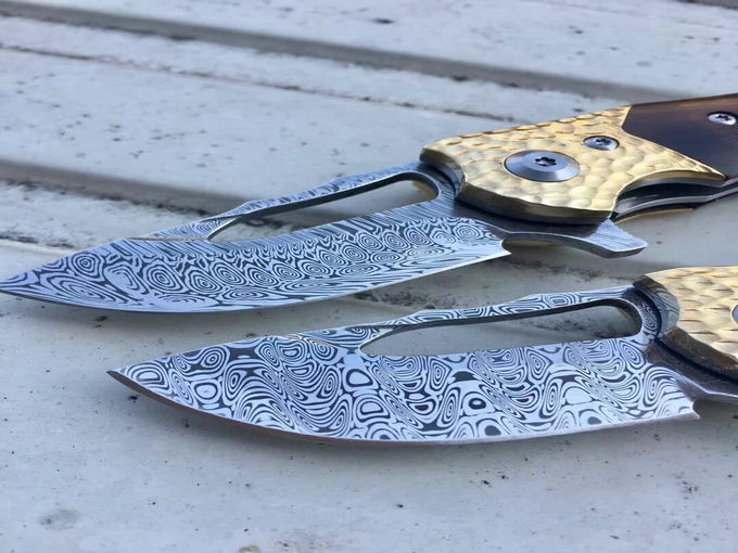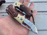 该刀采用瑞典粉末大马士革刃材(天梯纹或火焰纹)一体快开鳍。主轴镶嵌高精度陶瓷滚珠轴承,开合顺滑。刀柄精挑美国沙漠铁木,一分为二,精工抛光。刀隔采用黄铜手工泡陨石坑。配备精工牛皮镶嵌蛇皮皮套规格:全长12.5cm,刃长5cm,刃厚2.5mm,刃宽2.5cm,硬度60hrc。