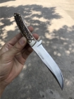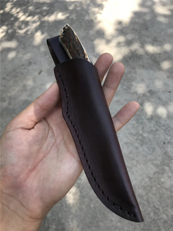 钢材:进口440C钢,真空热处理,硬度:59-60HRC,总长:21cm,刃长:10cm,刃厚:4MM,刃宽:2cm,柄材:天然野生老鹿角柄,皮套:阿根廷进口植鞣皮,香港公司制作.包装:黑色礼盒!