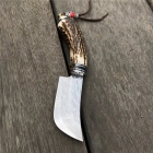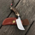 细腻鹿角料子,印花皮套、大马士革钢刀刃、锋利度超越刮胡子[阴险][阴险]、实用性非常强、刀刃表面锻打凹凸原纹[强]、全长尺寸:15cm、刃长:7cm、手柄长:8cm、厚度:3mm、硬度:59HRC、【钢材】大马士革钢VG10、、、、
