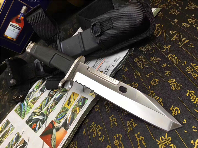 带套火环,可装备M4/M16,刃面有刺刀口,可剪铁丝网(此功能是根据老毛子ak刺设计来的)非常经典,自带磨刀石,户外功能更加强大全长 31.2 CM 刃长 18.2 CM 刃厚 0.6 CM 刃宽 3.2 CM 硬度 58 HRC 柄材 玻璃纤维+Forprene 产地 意大利 附件 尼龙刀鞘 绑腿