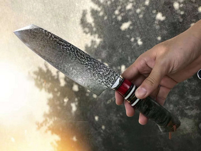 日式三德刀,尾单数量89把,每一把都是纯手工制作独一无二!钢材由日本客户提供VG10夹层大马士革钢,柄材采用搞密度稳定木手工打磨!表面保留锻造捶纹复古效果!日本客户要的就是这种效果!优点表现,钢材锋利度与韧性表现出色,手工制作,独特收藏实用必备厨房刀送礼佳品!