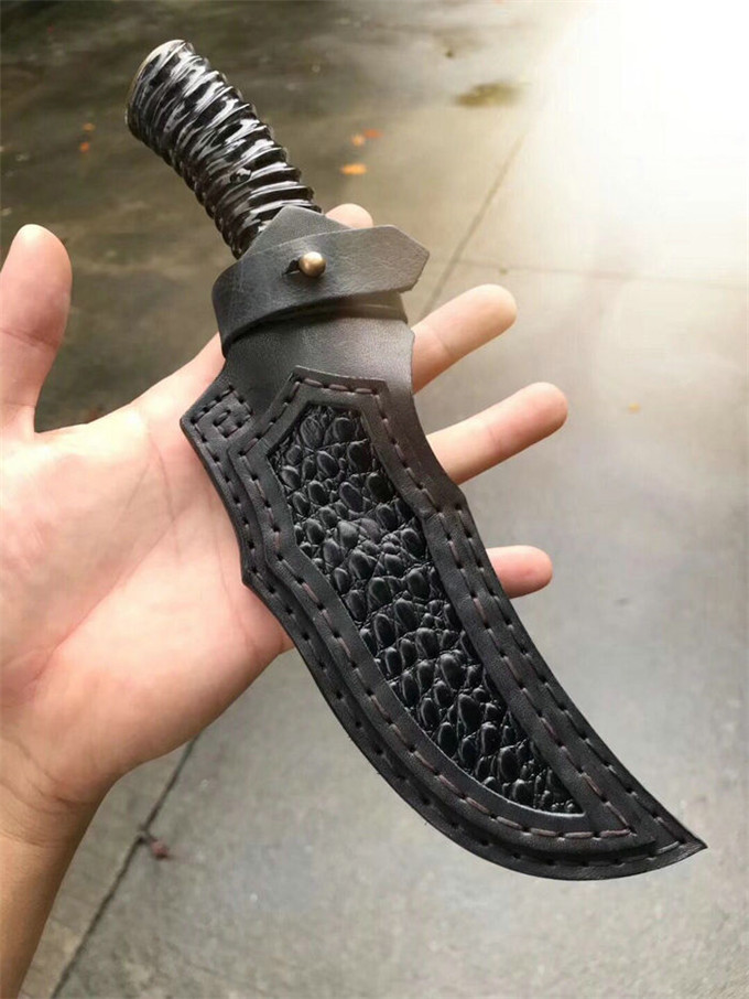 总长:25.5cm,刃长:11.5cm,刃厚:4MM,刃宽:3.5cm,钢材:由台湾公司提供自主锻造大马士革钢76层,硬度60HRC,表面效果;保留捶打纹理抛光处理,耐锈!柄材:正宗野生黑羊角+科檀木+牛骨+G10,皮套:真皮手工缝线制作,包装:手工礼盒包装.记住数量不多的,想买的不要犹豫了!很快就没有的!