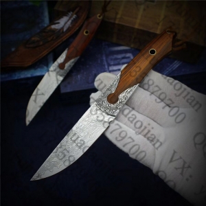 全长:19cm、刀刃长:8.5cm、手柄长:10.5cm、刃钢材:大马士革钢,刃厚度3mm,硬度:60HRC(经多道工序处理)