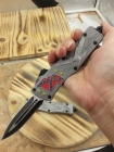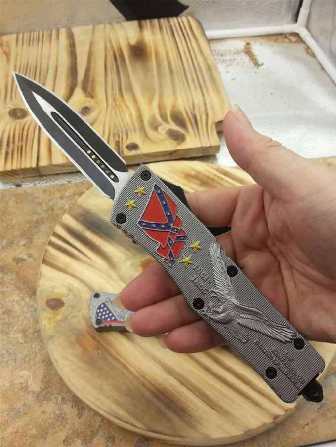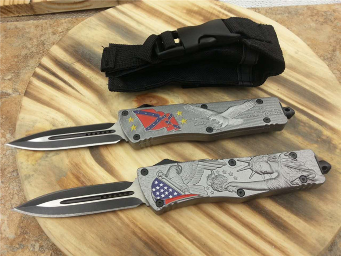 自由女神,飞鹰直跳。美国的文化象征!直跳款式,战术石洗风格,外贸款式,规格 全长:22.5CM刃长:9CM柄长:13.5CM刃 厚:0.3CM硬 度:56 HRC刃 材:440表 面:石洗净 重:295克(整刀) 毛 重:320克(含包装物)开 合:双动作,直推开关,自动弹出和收回包 装:耐磨专用战术尼龙套。
