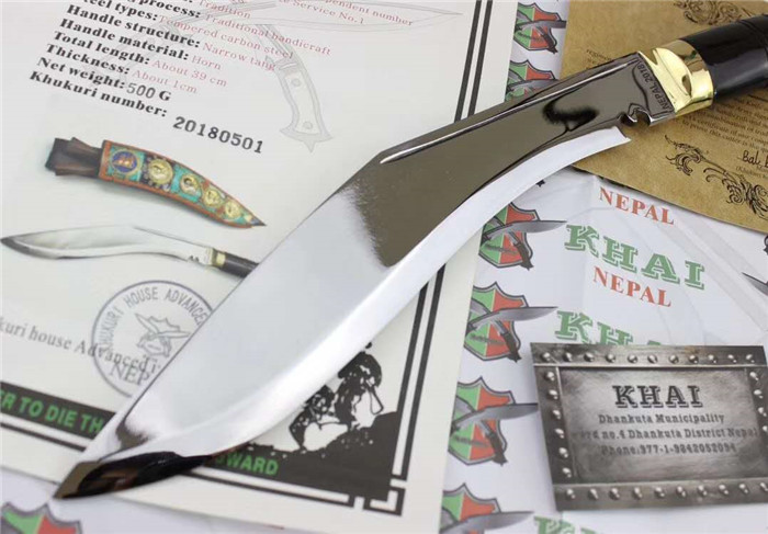 《士兵荣耀》廓尔喀弯刀service no.1 的荣耀版本(由尼泊尔顶级弯刀生产商KHAI公司为纪念四位战功显赫的廓尔喀勇士而出品),在标准版service no.1的基础上对刀鞘和刀柄融入尼泊尔多宝镶嵌工艺。让其在实用性能不变的情况下更具收藏把玩鉴赏价值。全长39厘米左右,背厚度10毫米左右