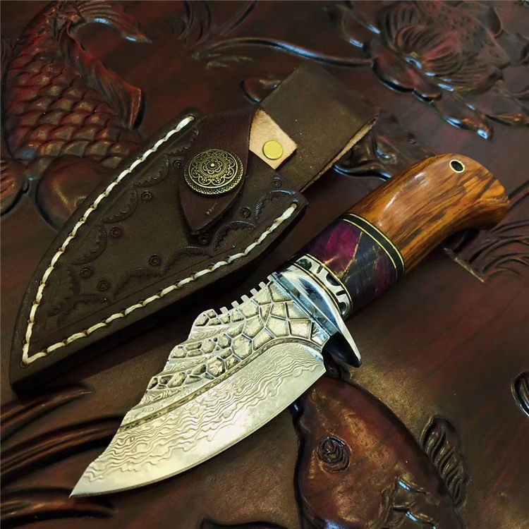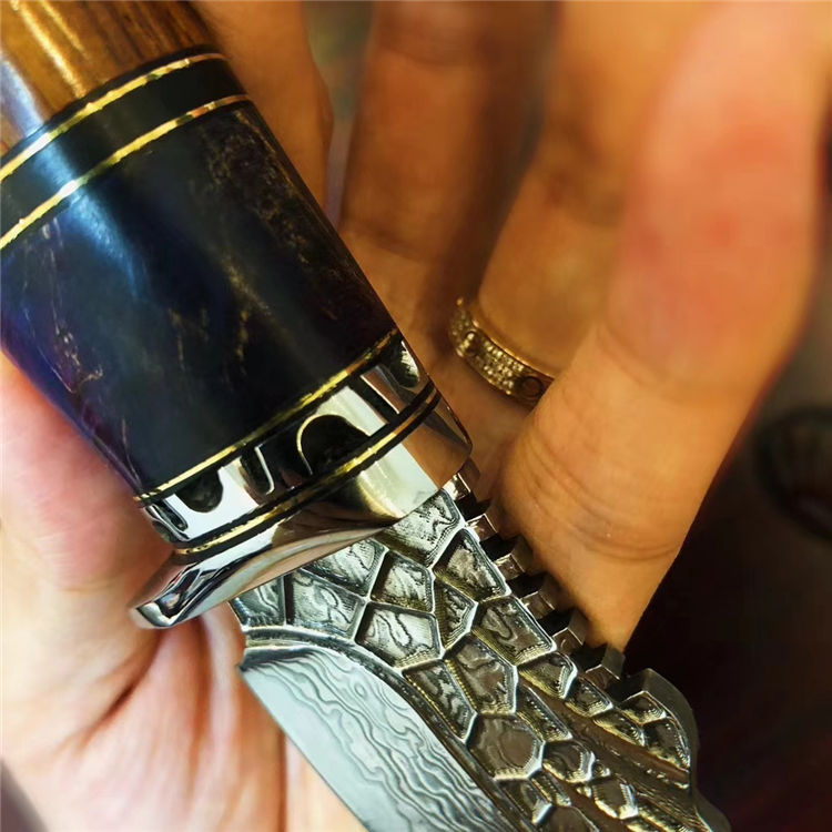 原创设计龟裂纹此独特纹路,展现一新.款式设计合理出色、刀柄顶部设计如佛鳄般凶猛的三爪式.高贵霸气、搭配精挑细选进口稳定化木与黄檀尾部鹰嘴设计,手感更佳 完美的衔接凸显极致.刀刃钢材:进口大马士革钢(硬度60HRC)刀刃锋利无比、坚不可摧皮套(进口植鞣皮雕花手工缝制刀套)