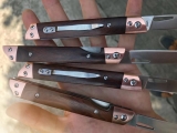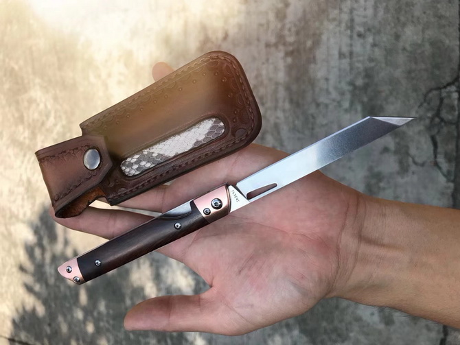 总长:21.8cm,刃长:9.5cm,刃厚:2.5mm,刃宽:1.5cm,钢材:奥地利进口M390粉末钢,硬度:60-62HRC,热处理:上海真空深冷热油淬热处理,开刃方式:水冷手工多次抛光开刃,柄材;美国沙漠铁木+紫铜,皮套:意大利