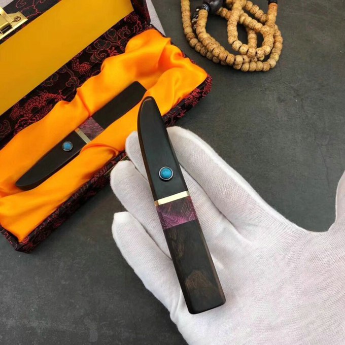 刃钢材:进口无夹芯层大马士革钢,木材厚度:1.9cm、手柄材料制作:黑檀木+固化稳定木+黄铜隔片+松石装饰