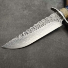 总长:28.5cm,刃长:15cm,刃厚:3.5mm,刃宽:3.5cm,钢材:日本夹层大马士革钢(钢芯层67层VG10钢)表面:抛光效果雕刻陨石坑工艺,热处理:真空热处理.硬度:58-60HRC,柄材:稳定化白影木和牛骨隔片包装:手工盒子包装!皮套:镶嵌珍珠鱼皮手工缝线植鞣牛皮鞘!