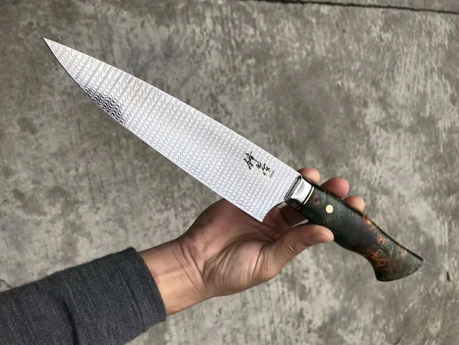 此刀为美国刀匠特别定制版手工制作大马士革厨师刀,钢材由日本进口VG10锻造大马士革钢,手柄采用树瘤稳定木,搭配意大利进口手工雕花镶嵌皮套!原装正品配实木盒子包装,高端大气!送礼必备与专业厨师级专用!每一把刀都是师傅手工匠心打造,每一把刀都是独一无二!是每一把收藏者必备作品!