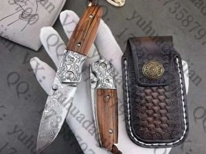 刃材进口锻造大马士革钢Vg10,真空热处理后硬度/60HRC,手工研磨开锋,表面祥云花纹非常高档,手柄雕花钢头搭配微粒老料黄檀木,佩戴手工雕花复古牛皮套装,